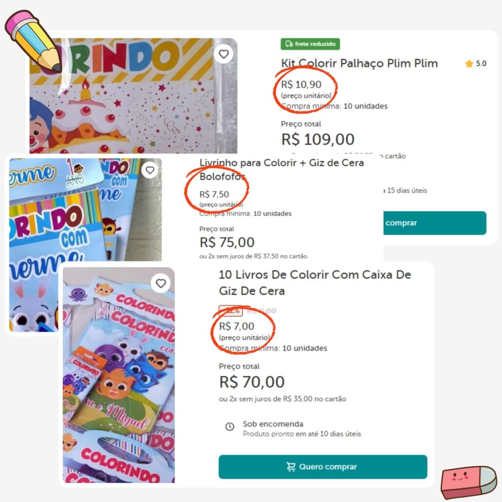 As revistinhas para colorir personalizadas sendo vendidas em algumas plataformas — e o valor por unidade varia entre R$7 a R$10!